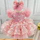This one is soft, with delicate braids and sequin embellishments, giving it a fairy-tale charm. It adds a touch of contrast, and the large bow at the waist adds another highlight. The fluffy skirt gives the little girl a dreamy feeling.