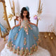 Description: This beautiful light blue dress is designed to make any little girl feel like a real princess. Fluffy tulle sleeves and shimmering beaded embroidery create a glamorous and dreamy look.