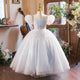 This girls' gown is made from luxurious tiers of tulle, each layer embellished with subtle sparkles that look like stars. The upper body is decorated with exquisite hand-embroidered floral patterns and diamonds, showing nobility and elegance. The soft puff sleeve design adds a sense of three-dimensionality and fantasy, and the overall shape is like a princess walking out of a fairy tale.