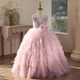 This girls' gown is made from luxurious tiers of tulle, each layer embellished with subtle sparkles that look like stars. The upper body is decorated with exquisite hand-embroidered floral patterns and diamonds, showing nobility and elegance. The soft puff sleeve design adds a sense of three-dimensionality and fantasy, and the overall shape is like a princess walking out of a fairy tale.