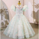 This girls' gown is made from luxurious tiers of tulle, each layer embellished with subtle sparkles that look like stars. The upper body is decorated with exquisite hand-embroidered floral patterns and diamonds, showing nobility and elegance. The soft puff sleeve design adds a sense of three-dimensionality and fantasy, and the overall shape is like a princess walking out of a fairy tale.