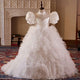 This girls' gown is made from luxurious tiers of tulle, each layer embellished with subtle sparkles that look like stars. The upper body is decorated with exquisite hand-embroidered floral patterns and diamonds, showing nobility and elegance. The soft puff sleeve design adds a sense of three-dimensionality and fantasy, and the overall shape is like a princess walking out of a fairy tale.