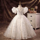 This girls' gown is made from luxurious tiers of tulle, each layer embellished with subtle sparkles that look like stars. The upper body is decorated with exquisite hand-embroidered floral patterns and diamonds, showing nobility and elegance. The soft puff sleeve design adds a sense of three-dimensionality and fantasy, and the overall shape is like a princess walking out of a fairy tale.