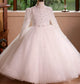 This girls' gown is made from luxurious tiers of tulle, each layer embellished with subtle sparkles that look like stars. The upper body is decorated with exquisite hand-embroidered floral patterns and diamonds, showing nobility and elegance. The soft puff sleeve design adds a sense of three-dimensionality and fantasy, and the overall shape is like a princess walking out of a fairy tale.